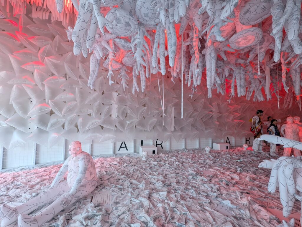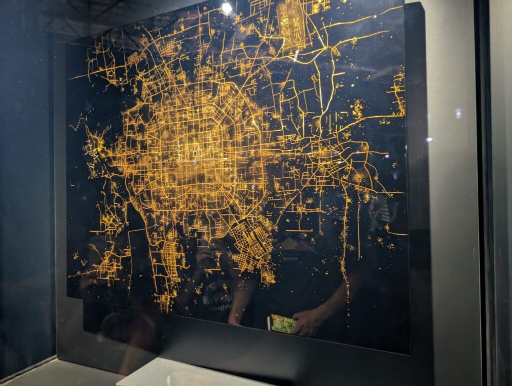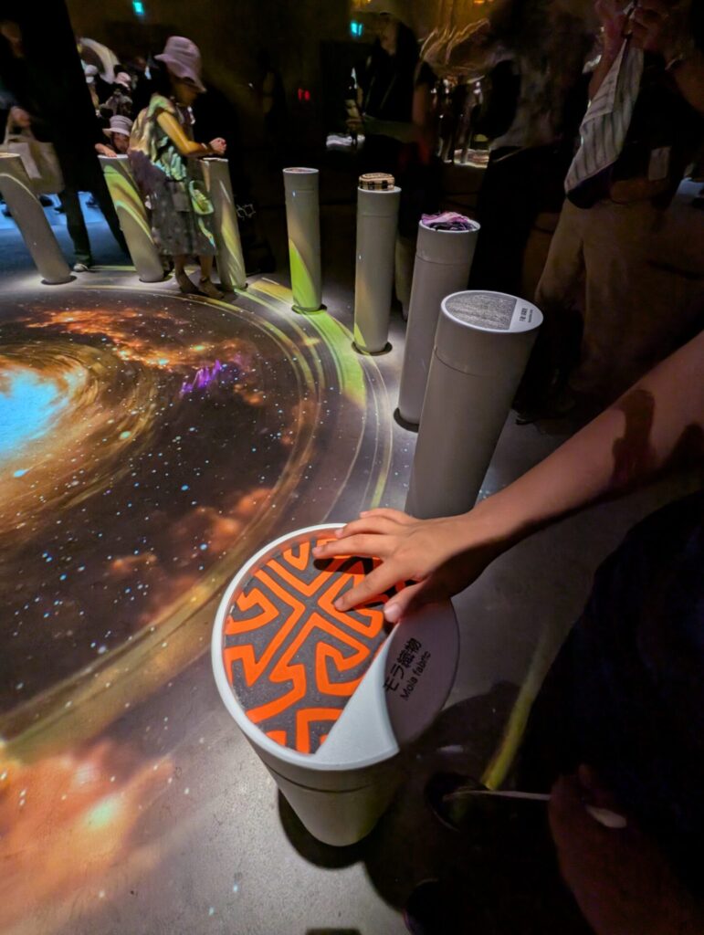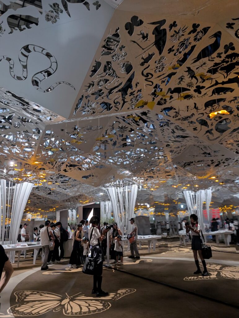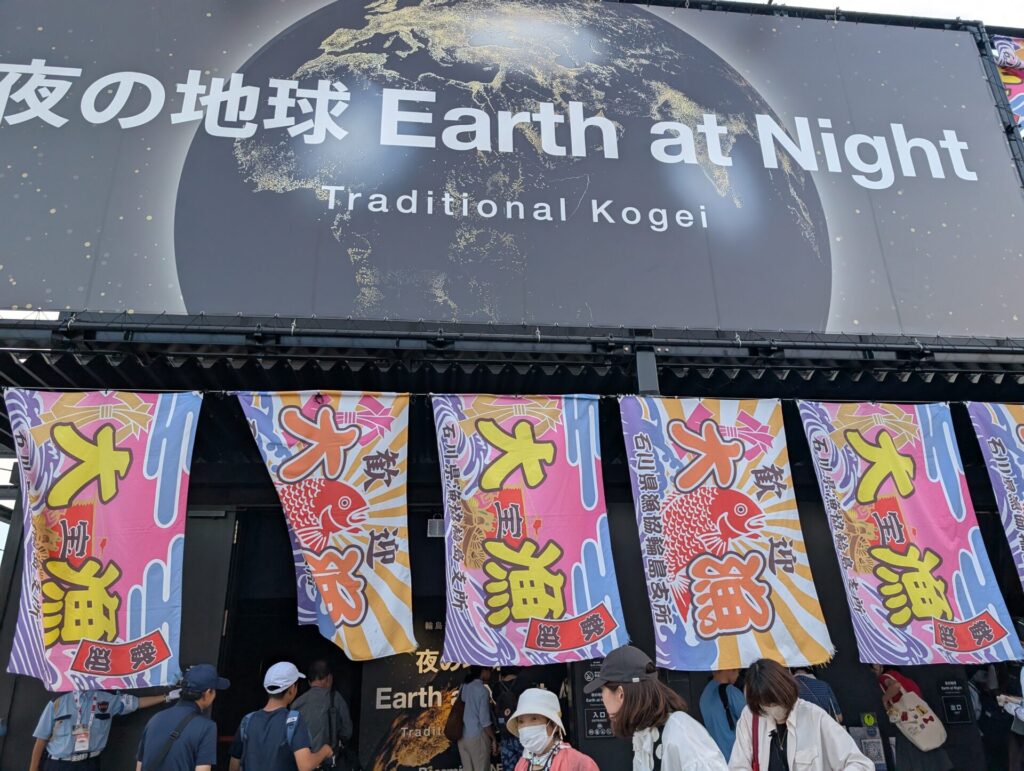 個人的に好きだと思ったのは、夜の地球。大漁旗??をくぐって中に入ると、輪島塗りで作った大きな地球儀の展示がありました。その壁際には世界の都市を衛星から見た夜の明かりを輪島塗で再現したパネルが。ニューヨークとか東京とか。これがとっても綺麗で、見入ってしまいました。こちらあまり行列せずに入れたので、見た方も多いのでは?