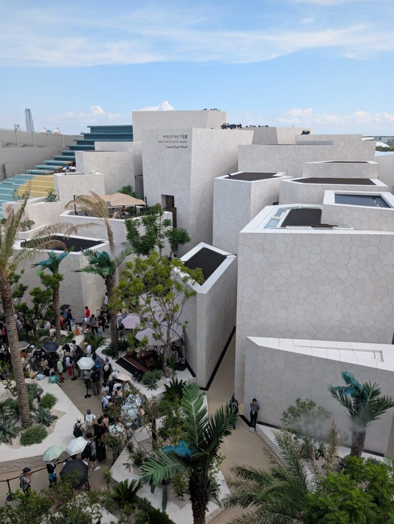 大屋根リングの上から見たスペイン館とサウジアラビア館。個性的な建物を眺めるのも万博の楽しみの一つでしたね〜